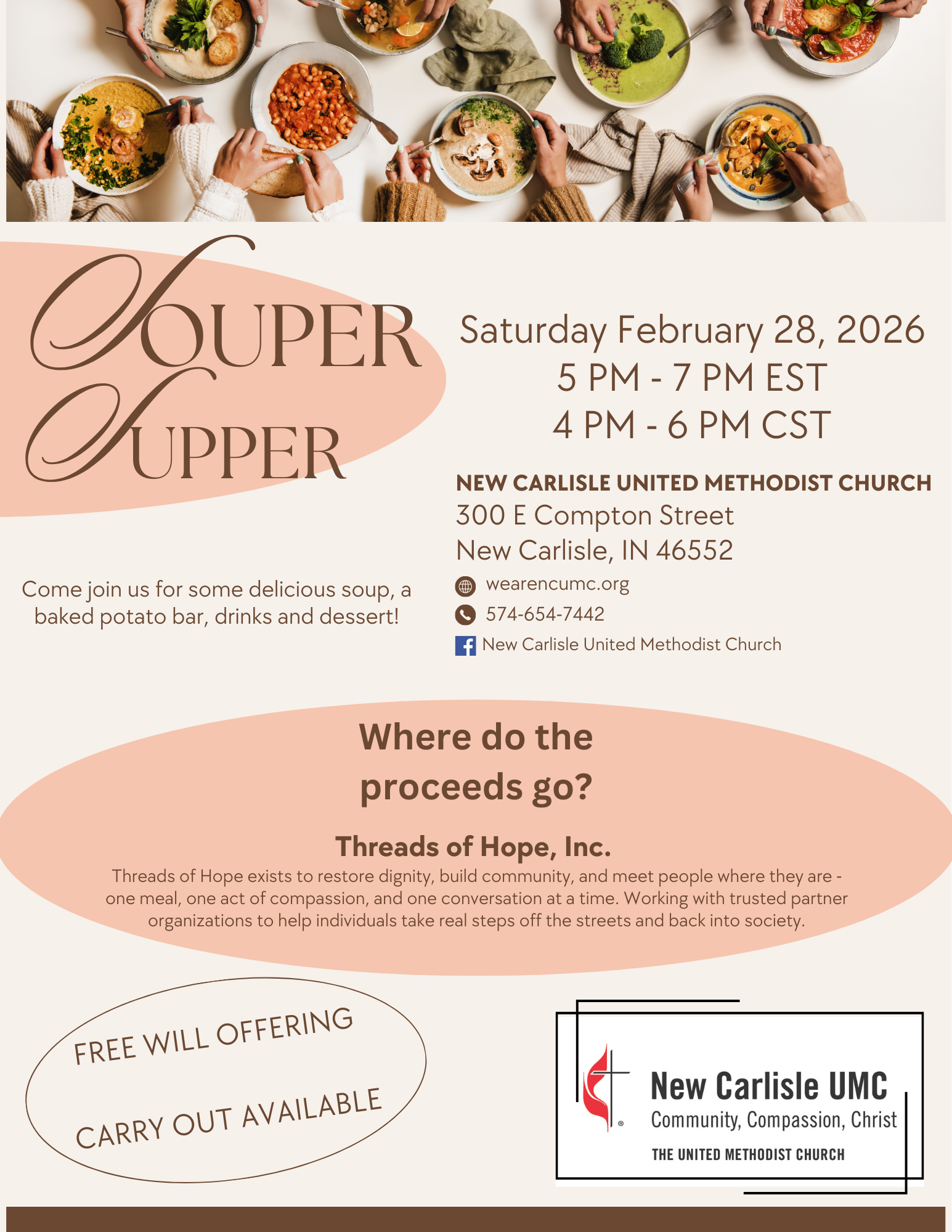 Join us for a lovely evening of soup and fellowship as we come together to support Threads of Hope, Inc.